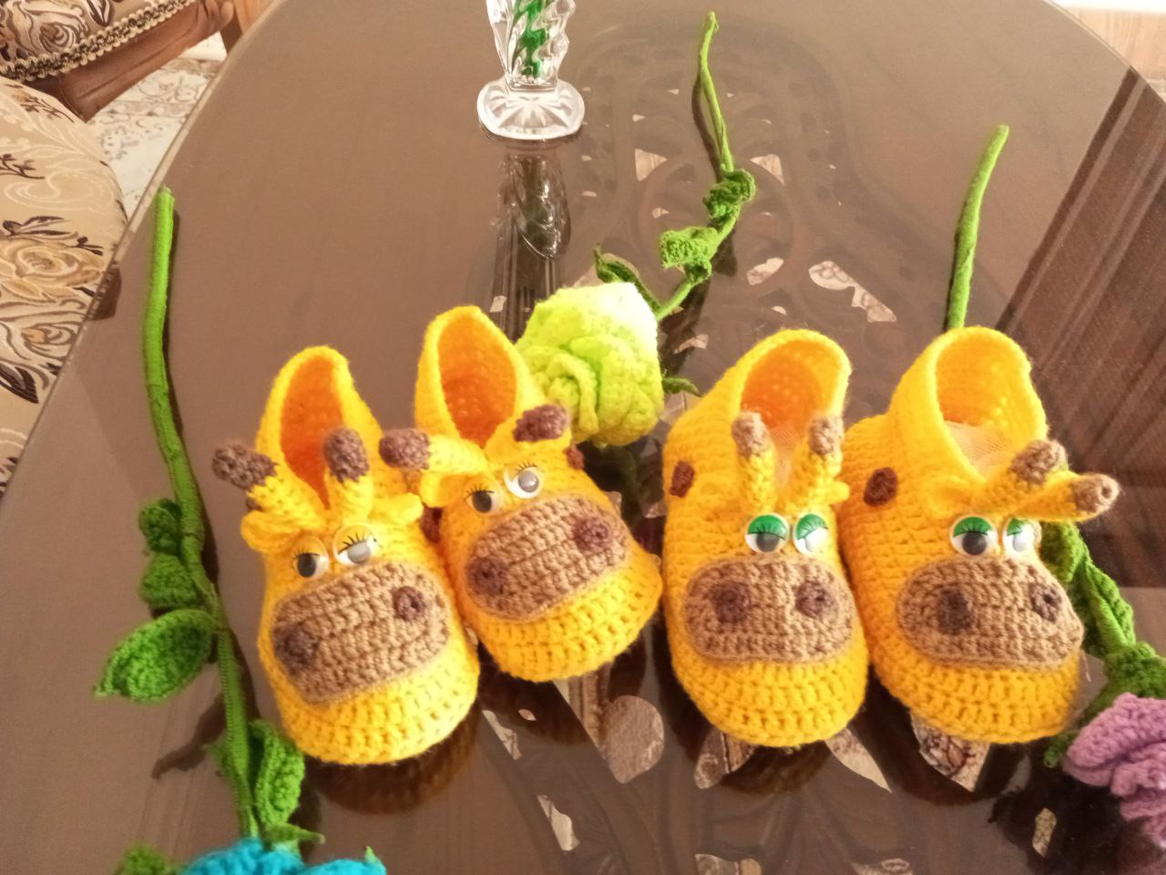 پاپوش نوزادی کار شده با کاموا و دارای چشم فانتزی و کف پا با کاموا ضخیم کار شده تا دوام بیشتری داشته باشد